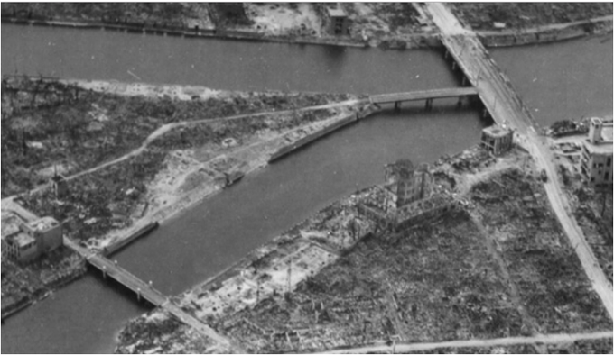 だとすれば、爆心地周辺を写したこの空撮写真で見れば、護岸の一部が崩れているこの地点が爆心地になるのではないでしょうか。